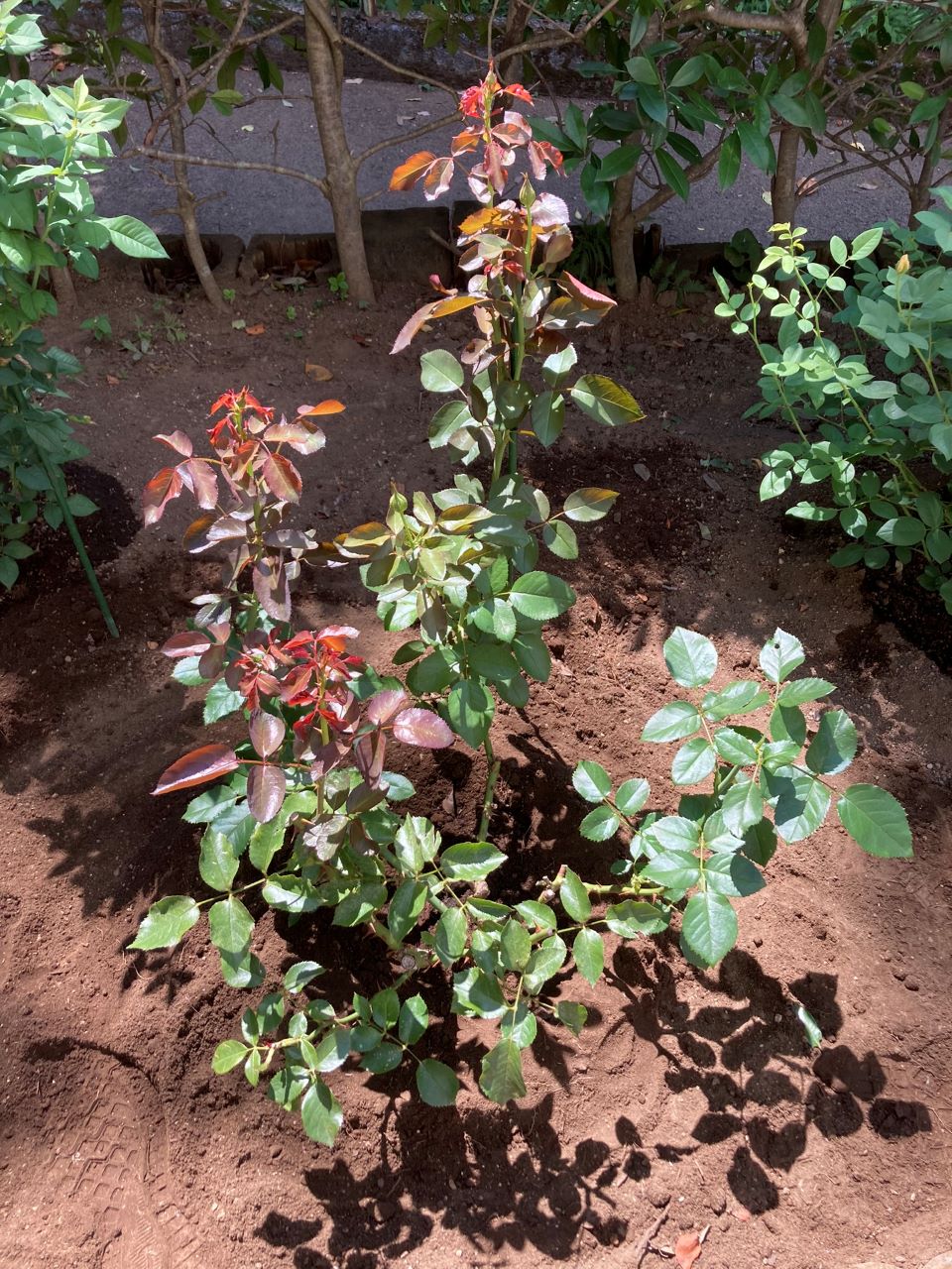 20230806 ニコール開花苗購入の12週間後に地植え。半横張樹形なので南側の庭の最前列に植える。かすれていた葉は、この後カット。