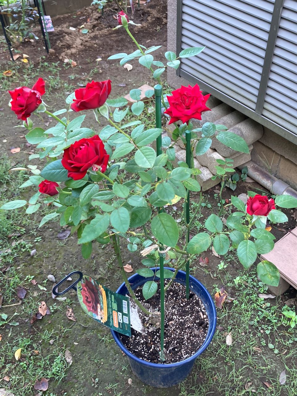 20230918 別株のイングリッドバーグマン6年株。日陰で年に1度だけ咲いていた株を春に西側に移植。その後、7月に鉢上げして、2か月後。小ぶりながら夏バラが一斉に咲く。