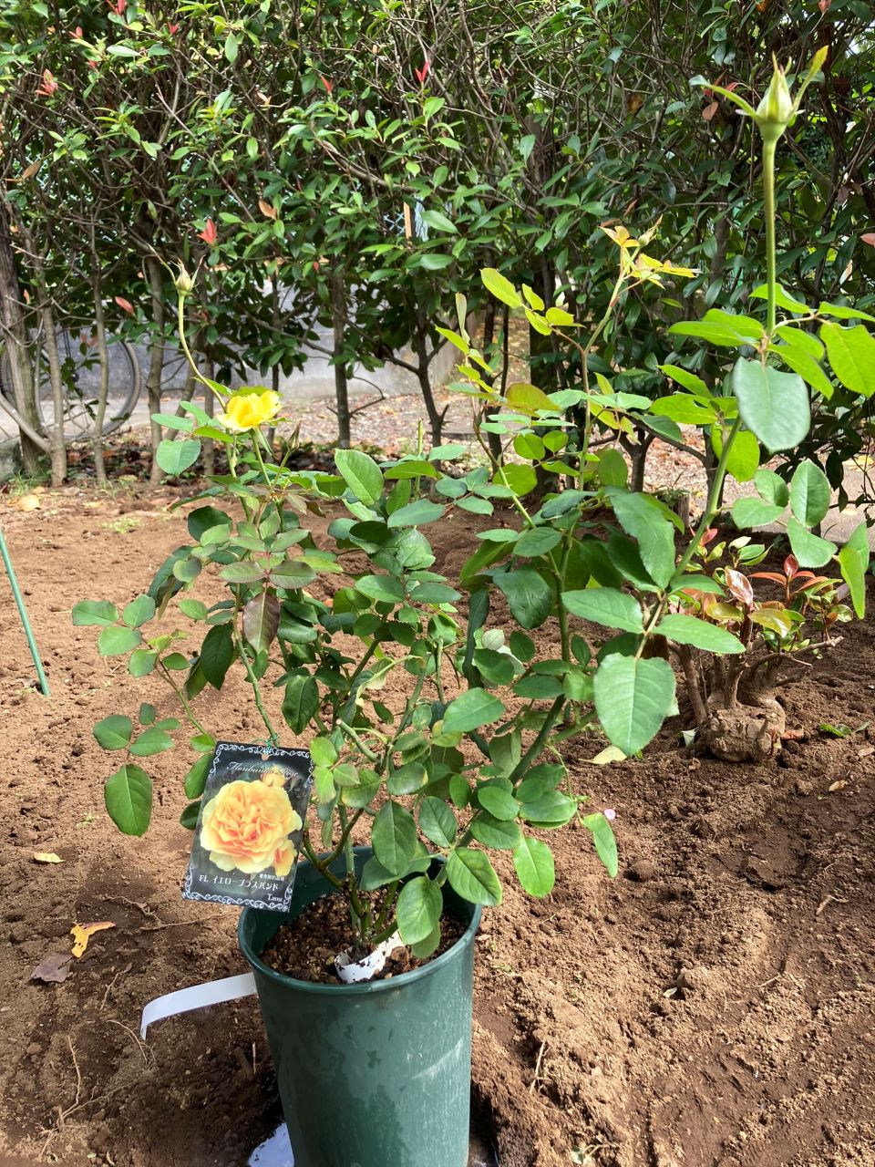 20231001 イエロー・ブラスバンド開花苗を購入。6号鉢から8号鉢に鉢増し。購入時は花が一輪咲き、根元の葉は一部黄色化していたので除去した。