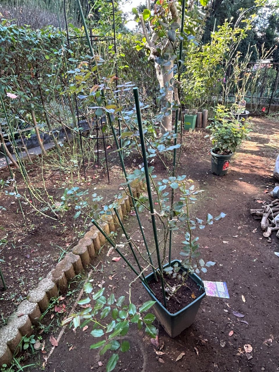 20231104 ローズアントワネット開花苗の11週後。枝を切り戻さなかったため、細い枝がさらに伸び、暖かさで葉もよく伸びる。下葉は黒星病にかかり、すべて除去して、新しい葉への伝搬を避ける。
