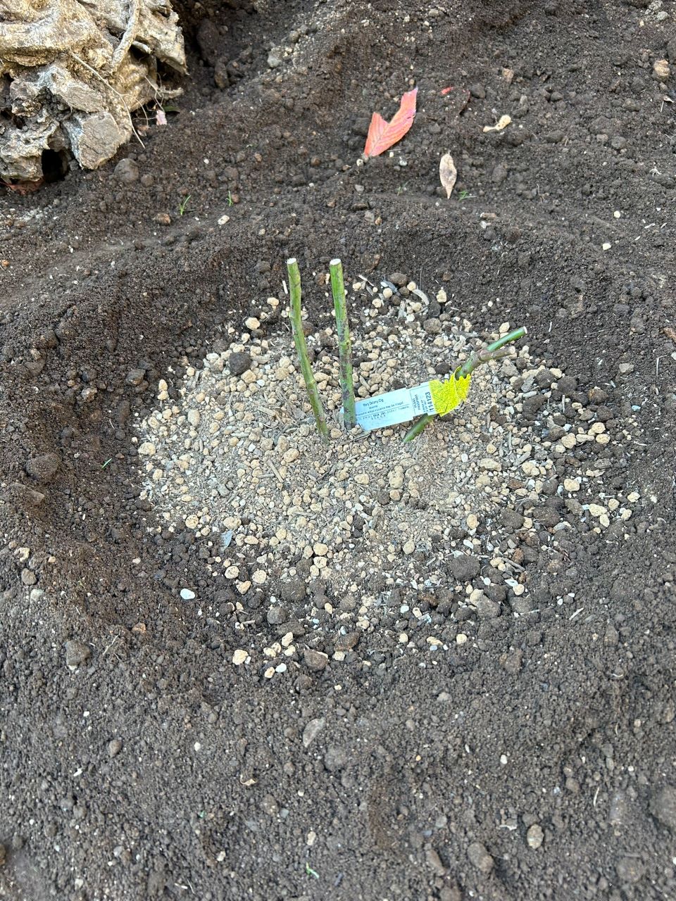 20231203 メアリー・ディレイニー裸苗を地植え。南東側に40cm径で45cmの深さの穴を掘り、土を入れ替える。そこに乾燥牛糞にバラの培養土を入れて、裸苗を入れ、バラ専用の団粒土で埋める。土は35Lほど必要だった。水はけは悪くないようにする。