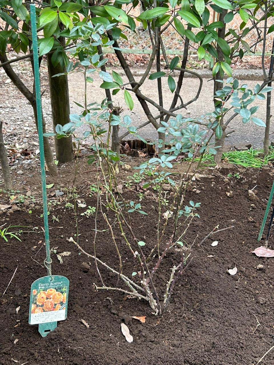 20240128 レディ・オブ・シャーロット開花苗10週後。庭の東側の垣根沿いに地植え。陽当たりを確保するために背の高めのシュラブにする予定。葉を残した状態で秋から日の当たるところで育てていたおかげで12号鉢に根鉢が出来ていた。