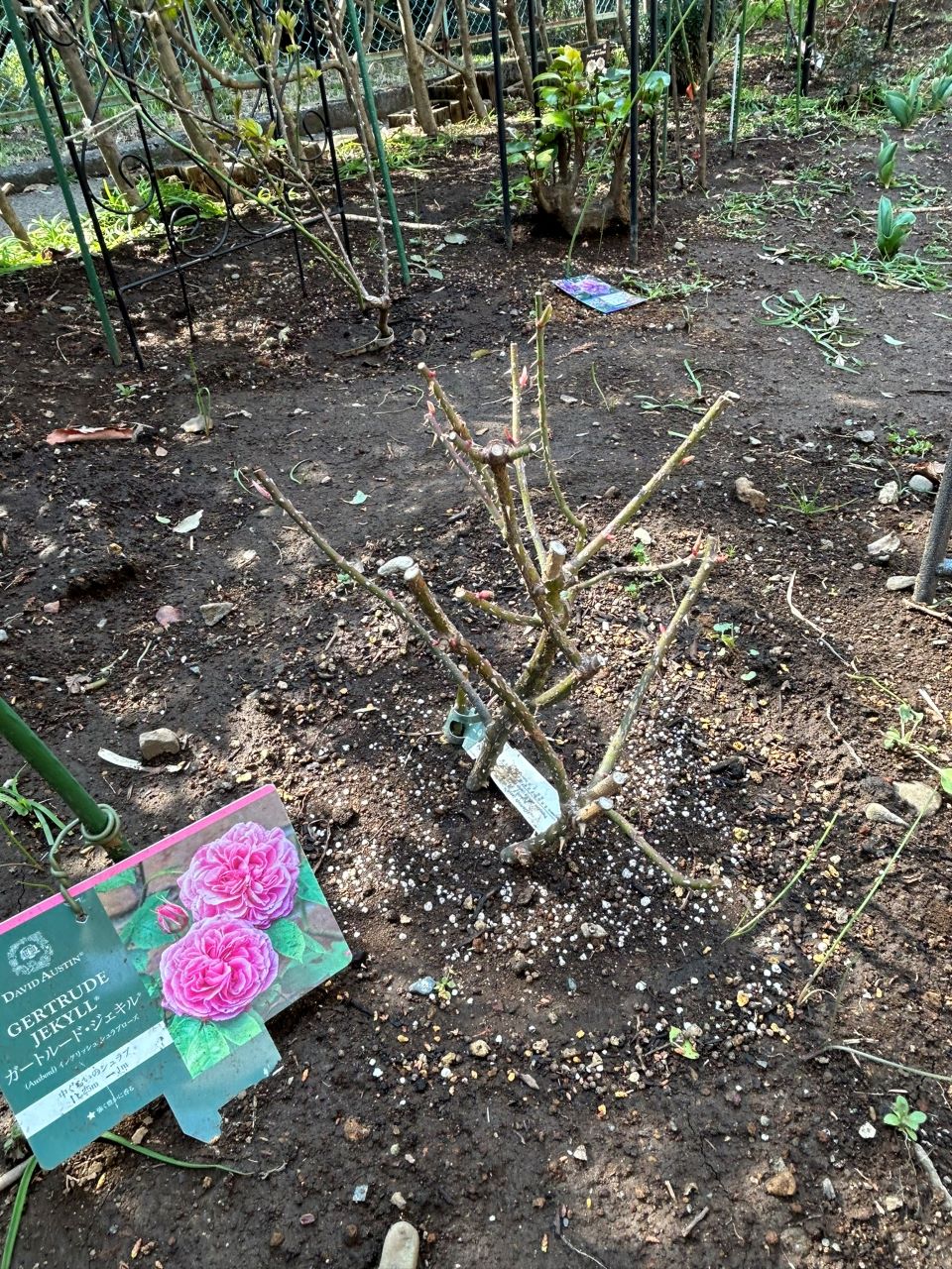 20240316 ガートルード・ジェキル代替苗の21週後。やっと新芽が出てきた。少し遅咲きタイプのようだ。