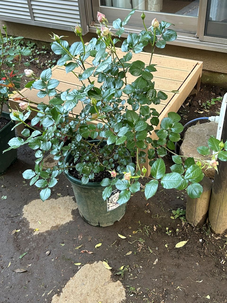 20240504 カミーユ大苗の22週後。多くの蕾が割れて、咲く直前で薄緑の花びらが見える。一部、雨に当たり、傷んでいる。