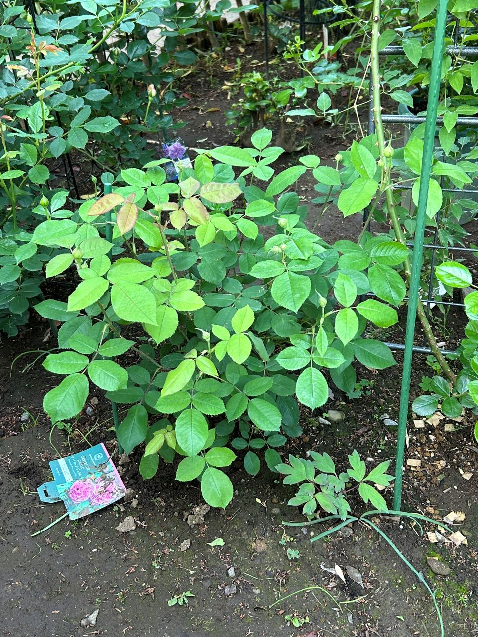 20240504 ガートルード・ジェキル代替苗の28週後。小さな蕾が上がり始めた。肥料を追加して土に混ぜ込む。アリが現れ始めたので、アリコロリヲ設置。