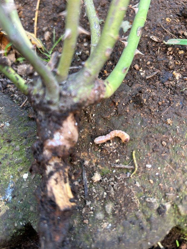 20241123 プリュネルの開花苗33週後。8/31に8号鉢に鉢増ししていたが、全く根はそこから広がっていなかった。根鉢を崩したところ、根切り虫やミミズはいなかったが、根元に鉄砲虫がいて、太根を食べられていた。