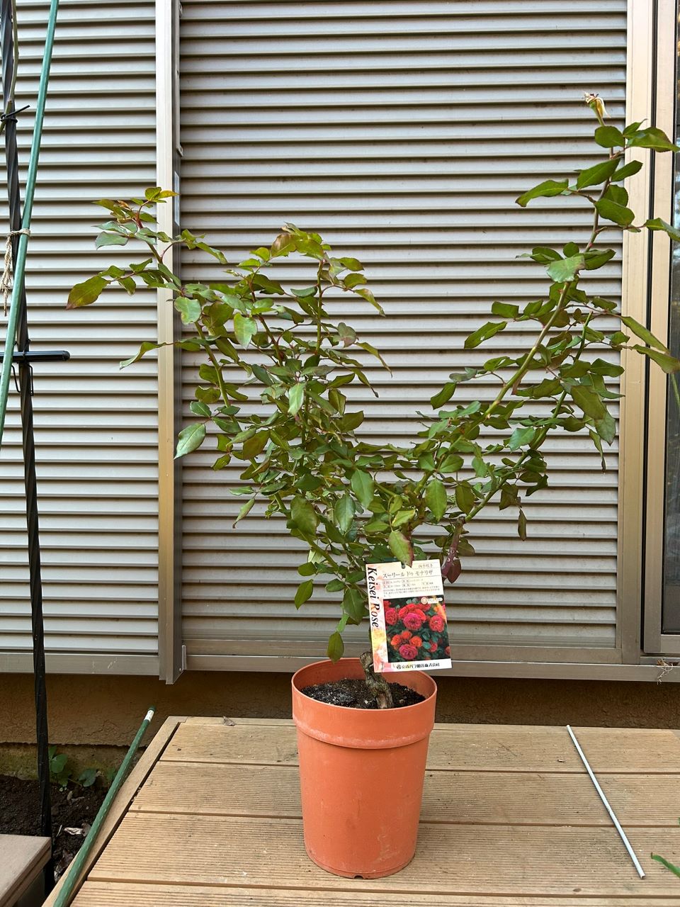20241201 スーリールドゥモナリザ開花苗購入。ザ・ガーデンの開花が終わった20%オフ品を購入。わずかに下葉に黒星病が出ているが、全体に葉は健全だった。根鉢も十分に形成されている。8号鉢に植え替える。