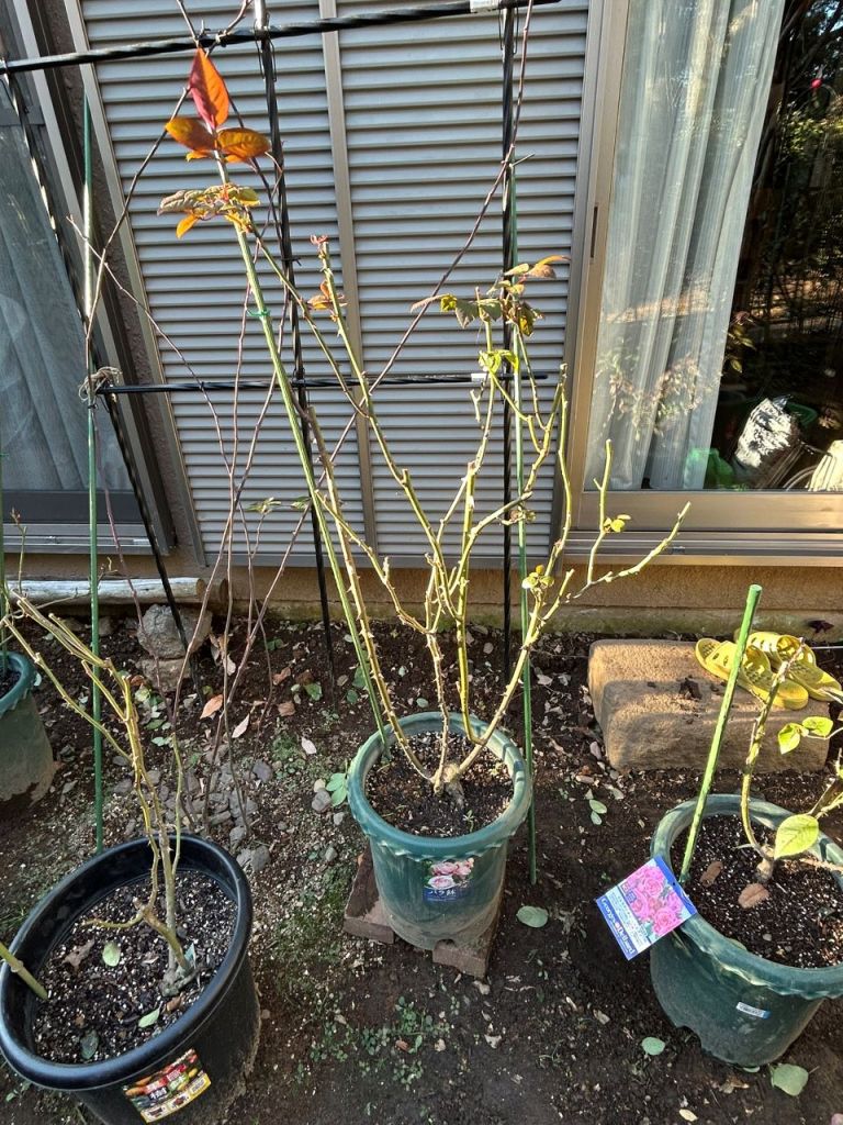 20250106 イングリッドバーグマン6年目旧苗の剪定。半分ほどの高さに強剪定した。あわせて、鉢替えした。古い太根で傷んでいるものもあり、除去した。根切り虫にやられたのか、新根があまり伸びていなかった。土は新しいものに替える。