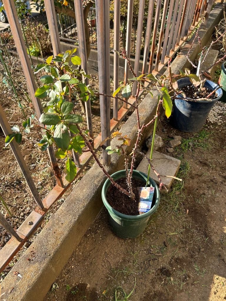20250118 コート・ドール中苗の6週後。朝霜柱が立つので緑の葉をむしり、剪定する。