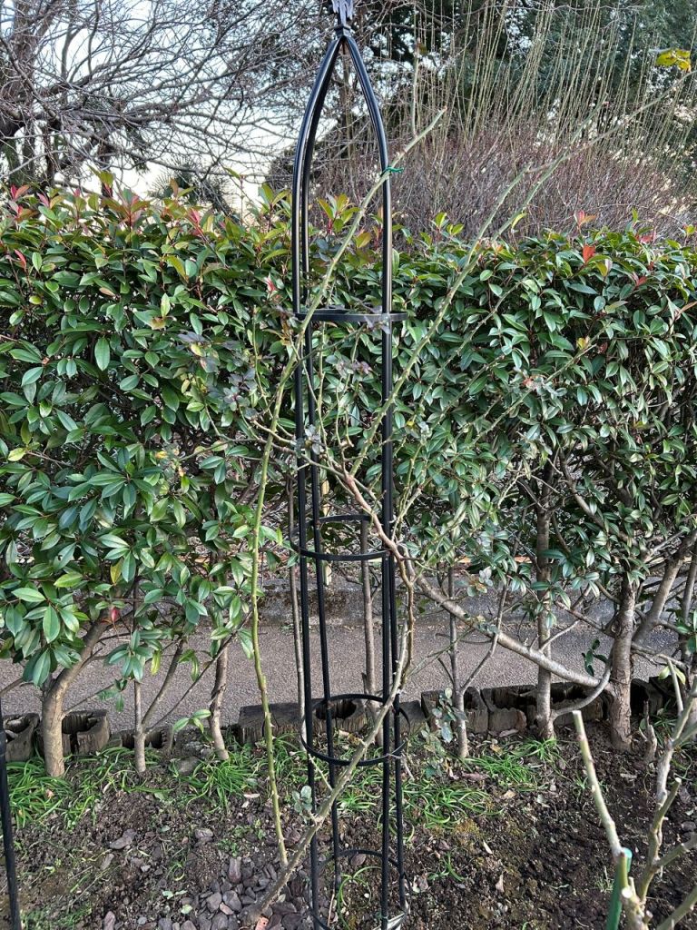 20250113 シンデレラ5月新苗82週後。枝が順調に伸びて、主枝は少し硬くなったので、径の大きなオベリスクの誘引し直す。