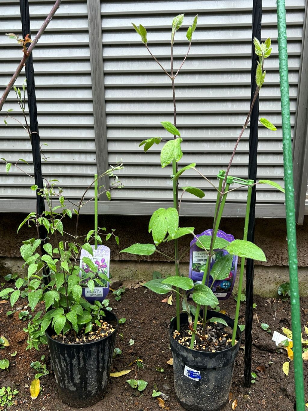 20250329 ミケリテ春苗が地際から多くのつるがでて、ポールに誘導した。