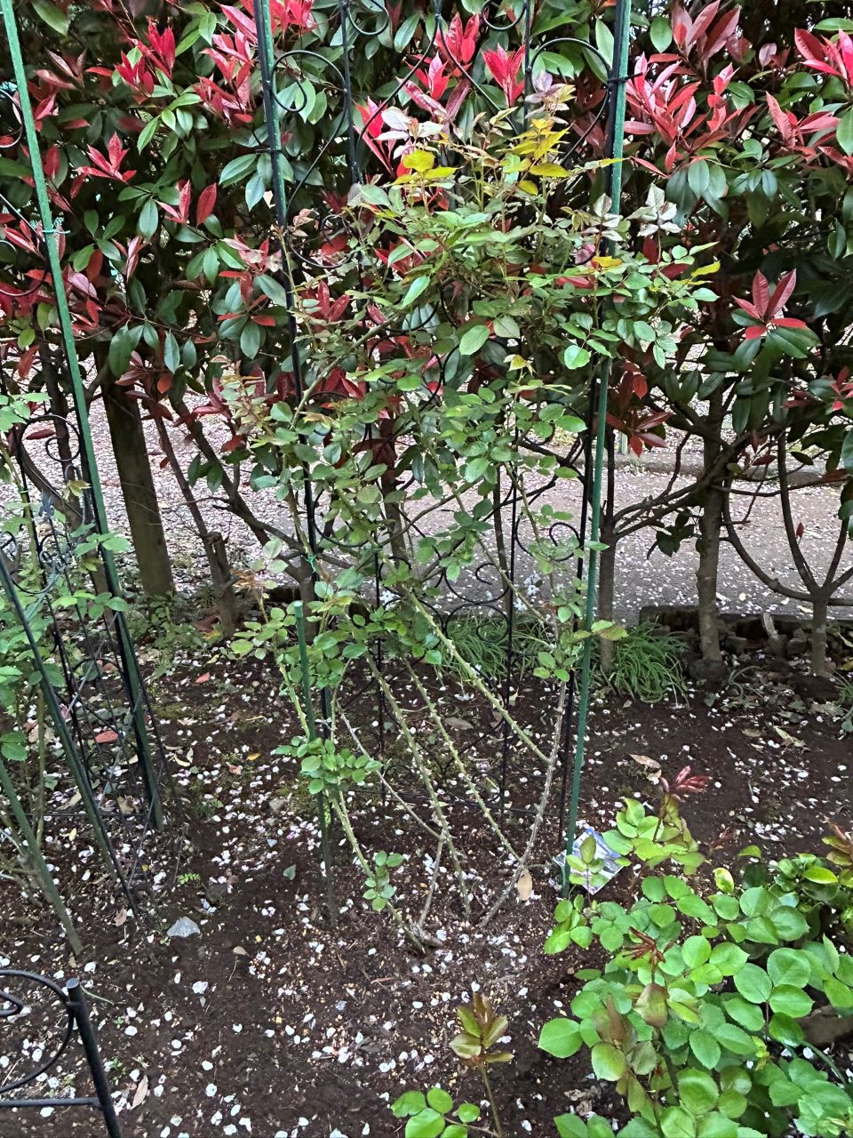 20250412 ローズアントワネット開花苗の83週後。日当たりが足りないのか、成長が遅い。有機肥料を施す。