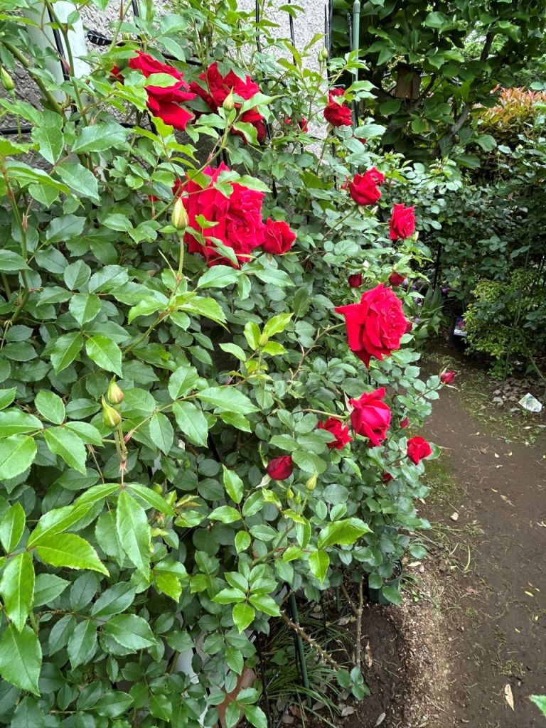 20250509 アンクル・ウォルター半長尺75週後。鮮やかな赤の剣弁咲きの大輪の花が一斉に咲く。