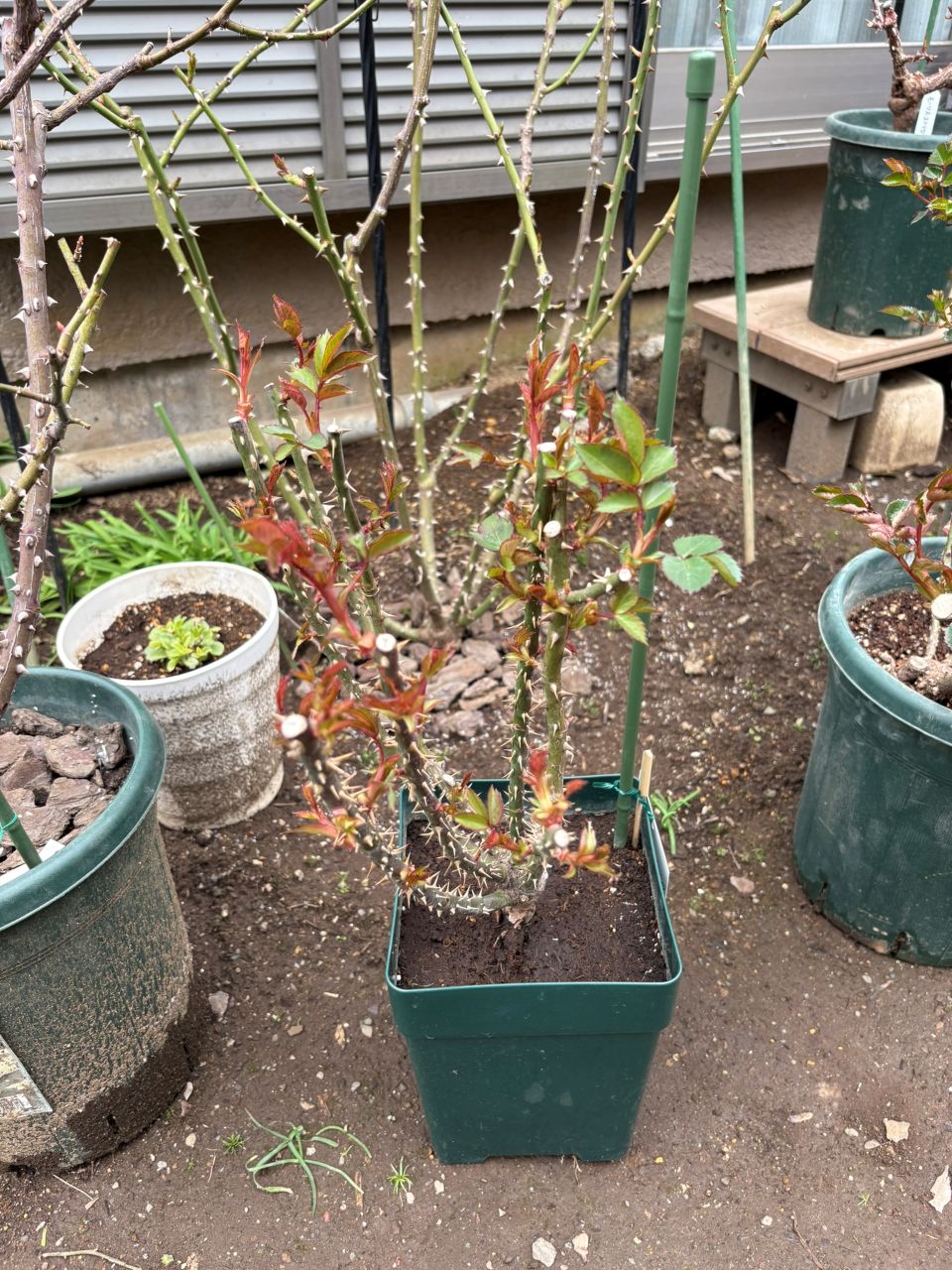 20260306 雨ニモマケズ・リバーシブルピンク大苗の6週後。葉が伸長してきた。
