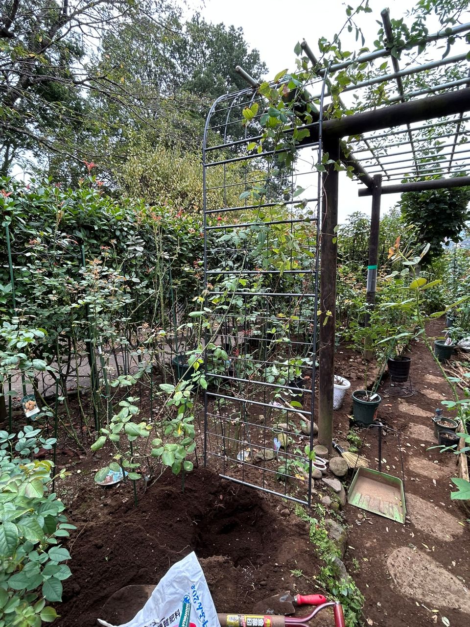 20250918 ガートルード・ジェキル代替苗の95週後。隣のアンジェラを掘り起こし、テスオブザダーバービルズを地植えする。