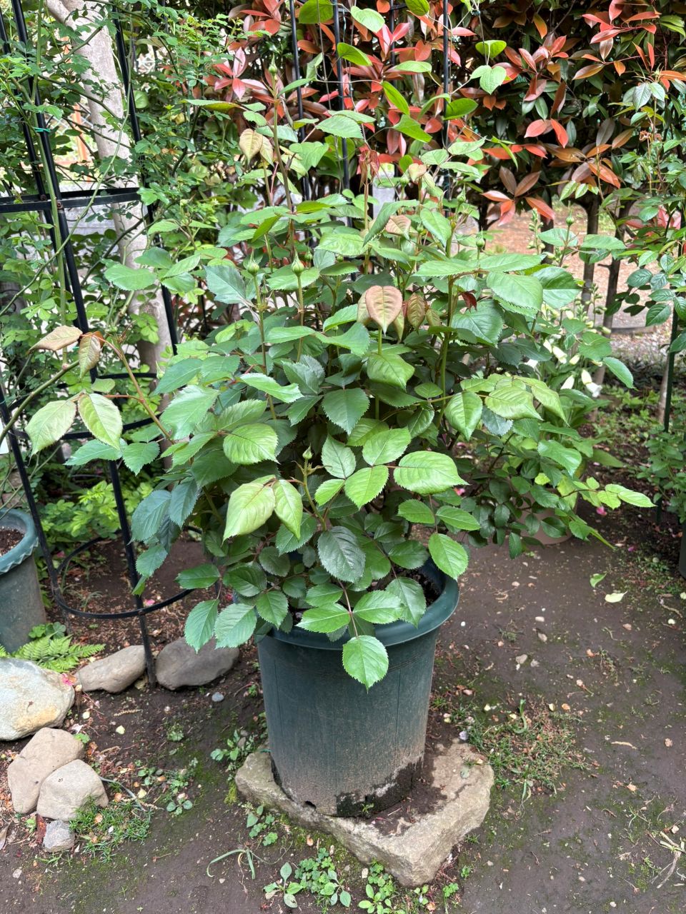 20260417 オリビア・ローズ・オースチン大苗109週後。立ち上がった花枝で蕾が膨らむ。