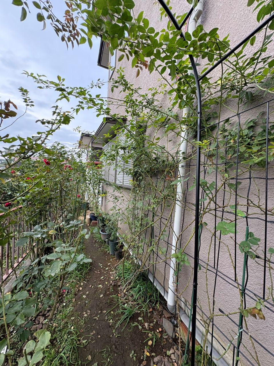 20251031 つるアイスバーグ半長尺苗の89週後。かなり枝が伸びる。手前にアーチを設置して誘引した。
